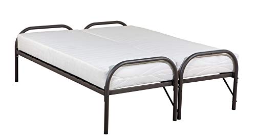 Een ruimtebesparend dubbel divan onderschuifbed, ideaal voor kleine ruimtes of voor gebruik als logeerbed. Dit dubbel divan onderschuifbed bestaat uit een onder- en bovenbed en heeft een lattenbodem met verende latten en kunstofkappen, wat zorgt voor een goed slaapcomfort. Het onderste uitschuifbed rolt makkelijk op stevige wieltjes onder het bovenste bed uit, hierdoor krijg je ook geen krassen op de vloer. Als het uitschuifbed uitgeklapt is, staat deze op pootjes en rolt deze niet weg tijdens het slapen. Naast elkaar zijn de bedden even hoog. Het Dubbel Divan bed wordt met Bonell matras geleverd. Indien u zelf over matrassen beschikt dienen deze niet hoger te zijn dan 18 cm. Het bed is heel eenvoudig zelf te monteren. Het metalen frame is alleen leverbaar in de kleur antraciet. Tevens is het Dubbel Divan bed leverbaar in twee verschillende afmetingen namelijk: 80×200 en 90×200